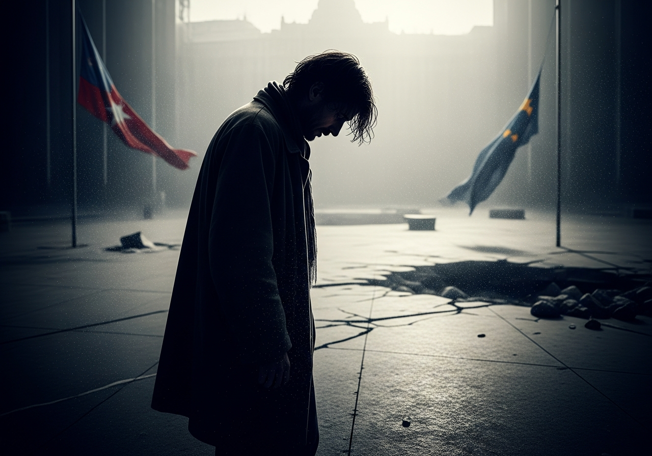 A lone figure, wearing a worn trench coat and looking pensive, walks down a dimly lit, narrow alleyway in a city, with shadows stretching long and distorted.