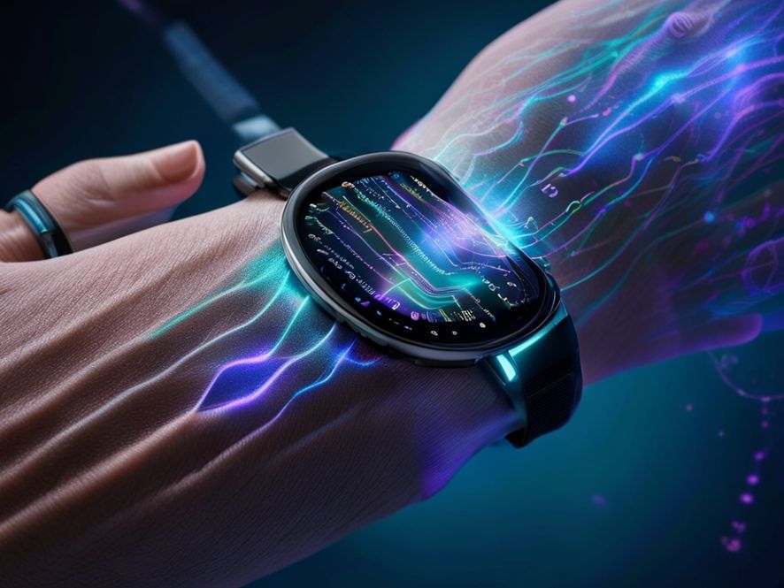 A person looking thoughtfully at their smartwatch, which displays complex health data graphs like heart rate and sleep patterns. The background is slightly blurred, suggesting a busy, modern life.