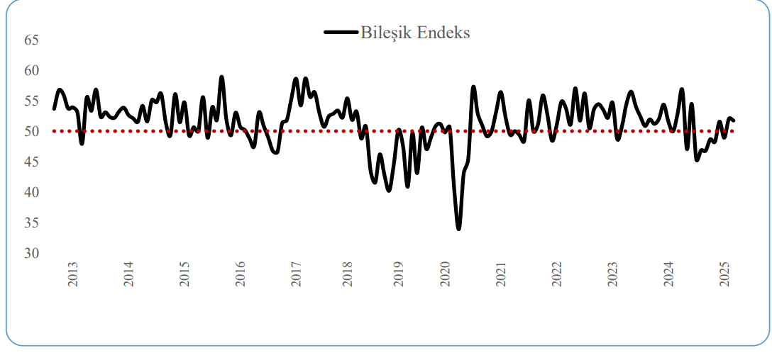Ocak ayında kaydettiği azalışın akabinde Şubat ve Mart aylarını referans kıymet üzerinde kapatan mevsim ve takvim tesirinden arındırılmış SAMEKS Bileşik Endeksi, 2025 yılının birinci çeyreğinde 50,9 puan ortalamasıyla, ekonomik büyümenin çeyreklik bazda devam ettiğine işaret etmektedir. Son 3 aylık seyri müspet bir grafik takip etmesine rağmen, sanayi bölümünün Mart ayında bilhassa yeni siparişler ve üretim tarafında olumsuz sinyaller verdiği görülürken, hizmet dalında ise iş hacmi beklentilerin altında kalmıştır.