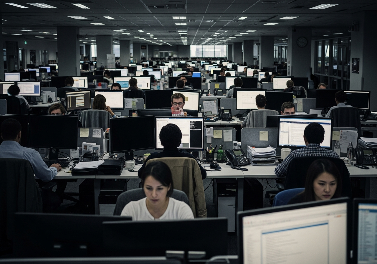 A dimly lit office filled with rows of desks, each with a person staring intently at a computer screen, their faces tired and focused. The overall atmosphere is one of quiet, monotonous labor.